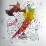 Peinture à l’encre de chine et encres de couleur sur papier. Un travail calligraphique mêlant lavis de couleurs abstraits, et un graphisme figuratif évoquant les 3 règnes, végétal, animal et humain, pour un souhait d’harmonie.