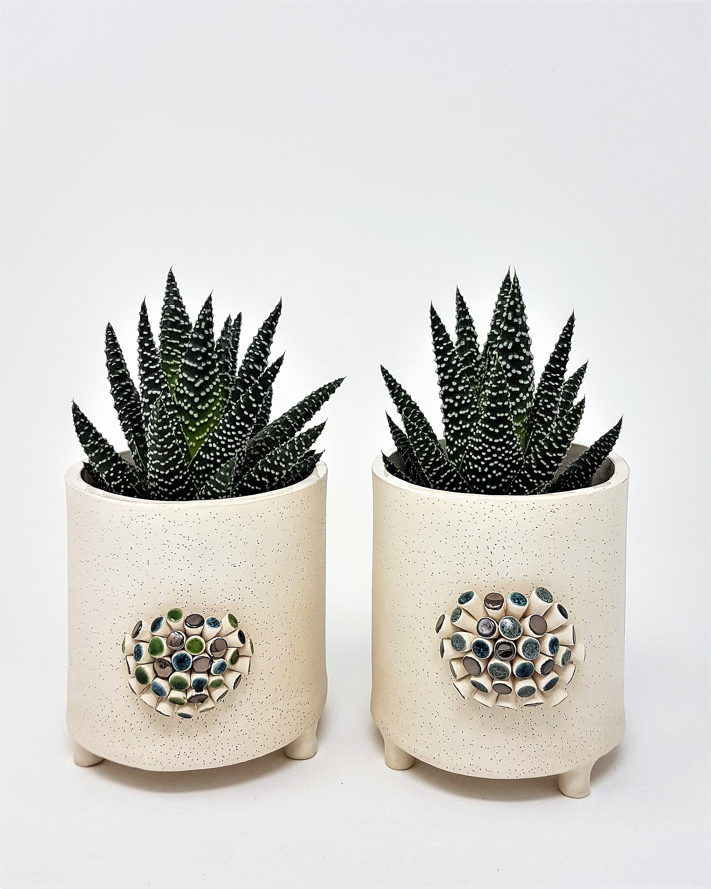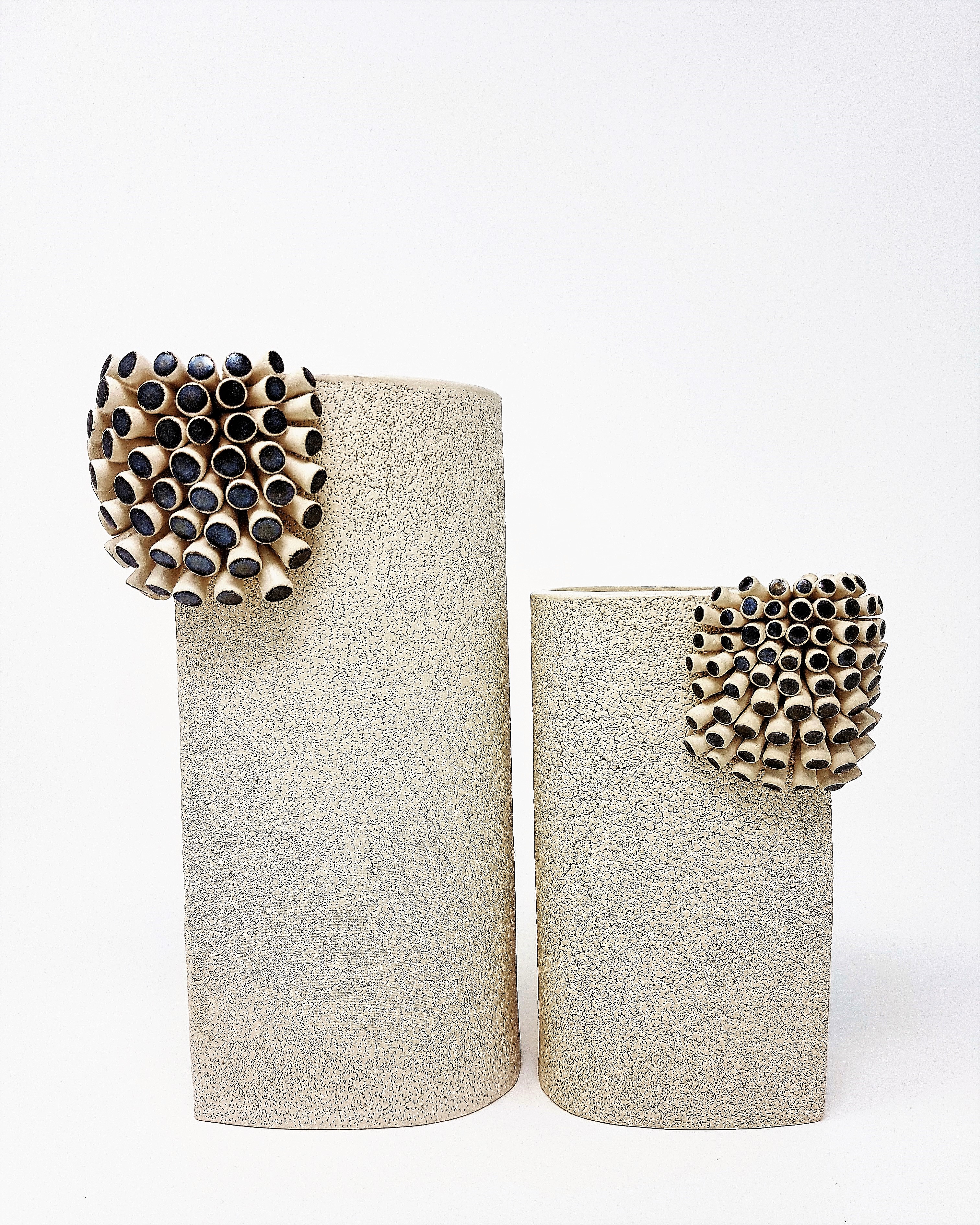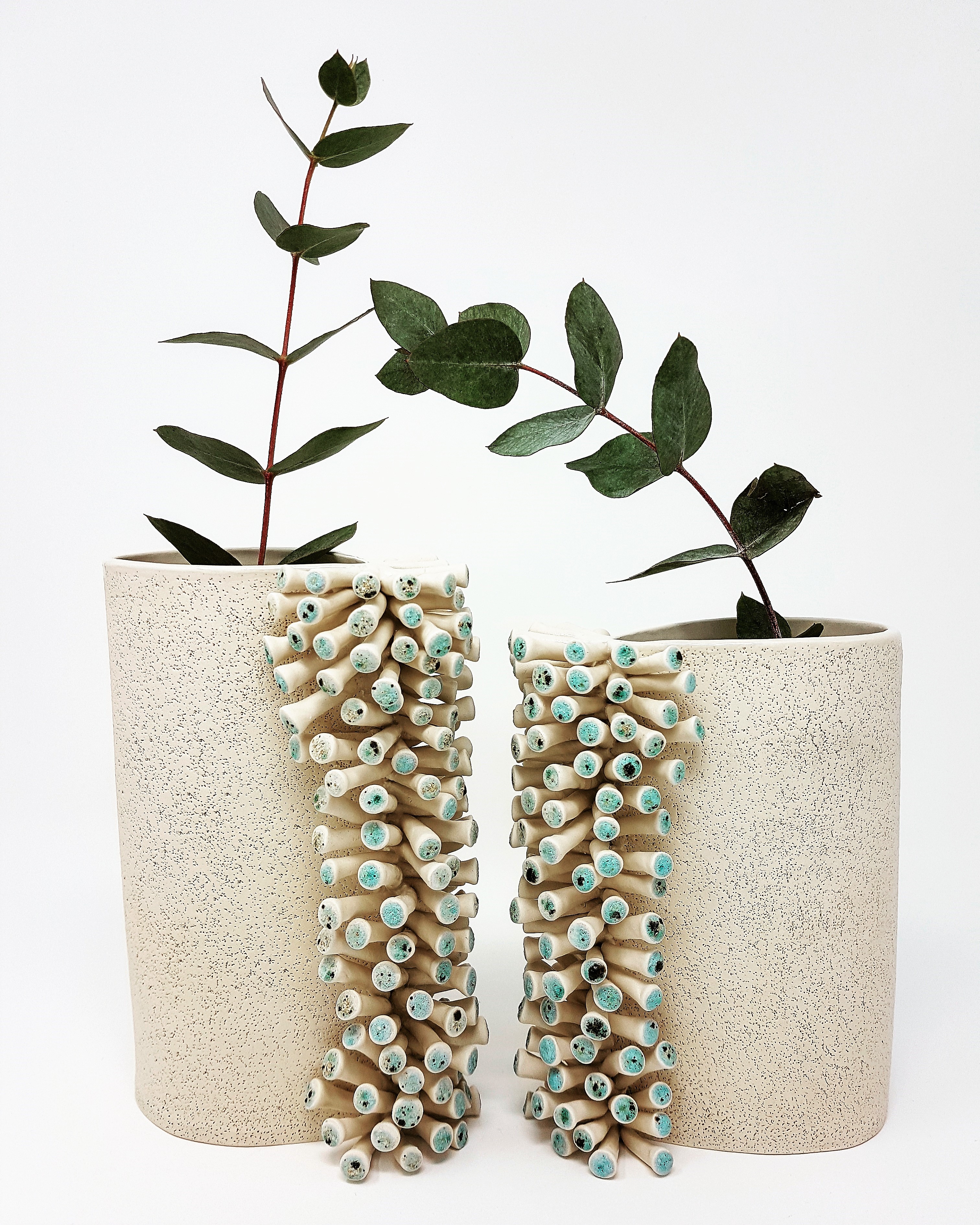 Je travaille à la fois avec des techniques connues (modelage, plaques et colombins) et d’autres qui me sont propres et que j’ai pu développer tout au long de mon parcours artistique. Je joue avec les formes, la matière et la poésie de l’instant. Je crée une gamme de produits très moderne, fine et raffinée. Mes pièces sont cuites dans un four électrique avec des émaux vifs ou neutres, brillants ou mats, tout en gardant le côté brut de l’argile.